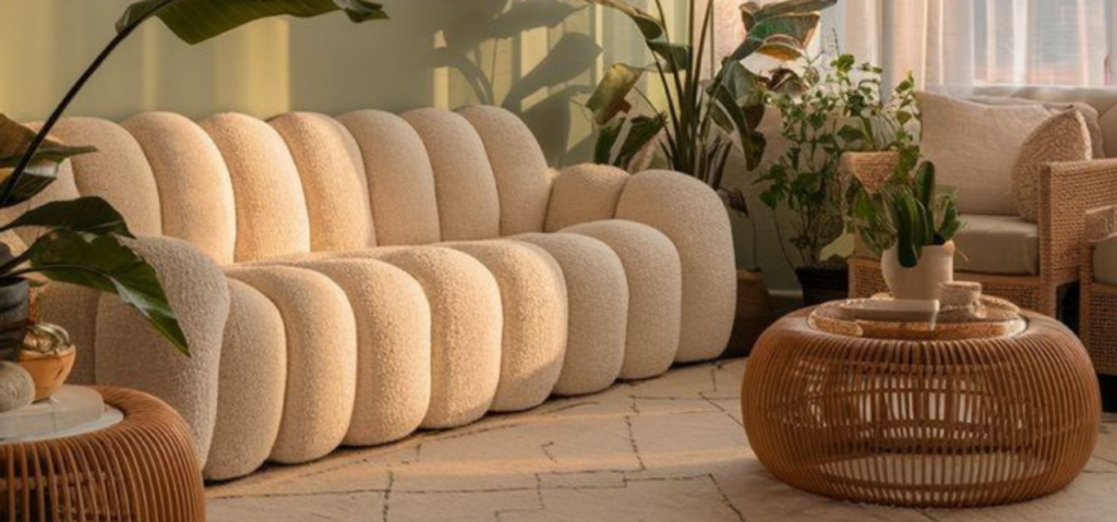 La paleta cromática se inclina por tonos vibrantes como el azul profundo, el verde esmeralda o el burdeos, combinados con neutros sofisticados como beige, blanco roto o negro carbón. En cuanto a las formas, predominan los volúmenes redondeados, los arcos y los diseños que evocan suavidad y movimiento, aportando dinamismo sin perder exclusividad.