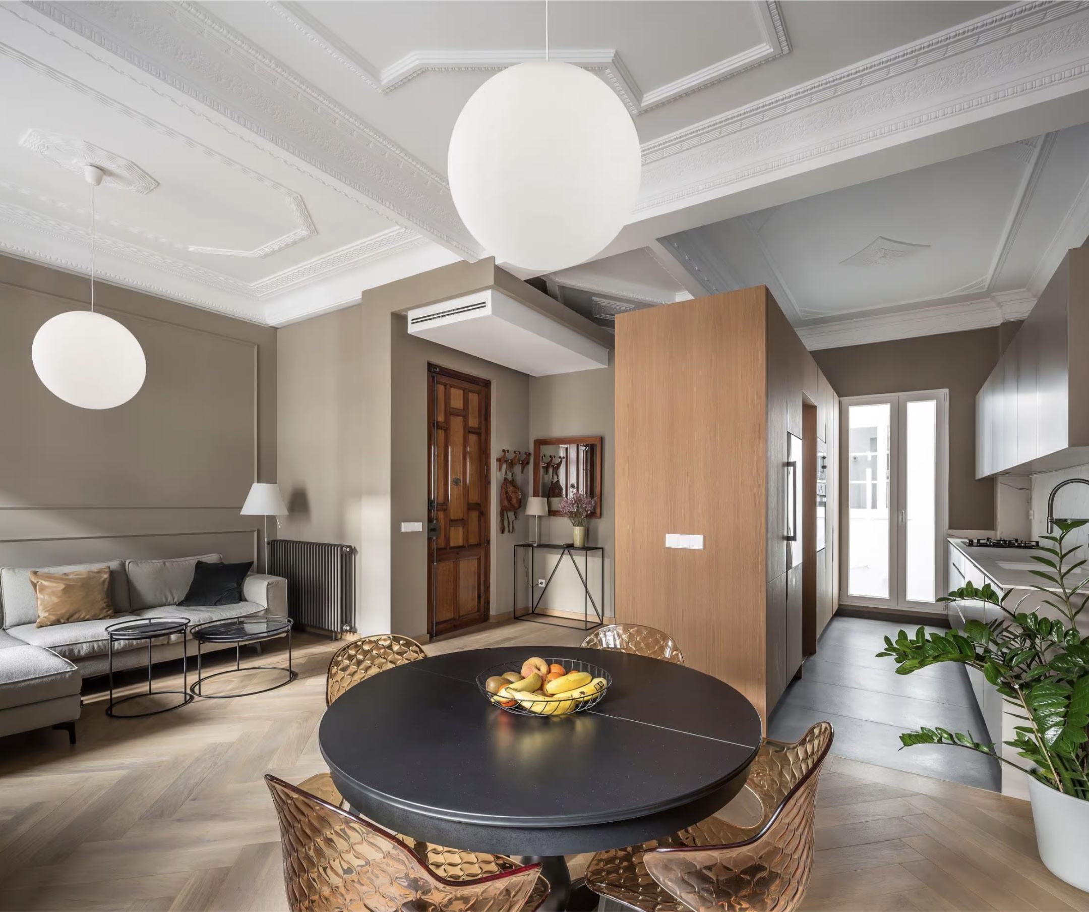 Esta vivienda respiraba en origen, antes de su segunda vida, una distribución complicada, muy compartimentada y oscura, con calidades de otro tiempo, fría y gris.