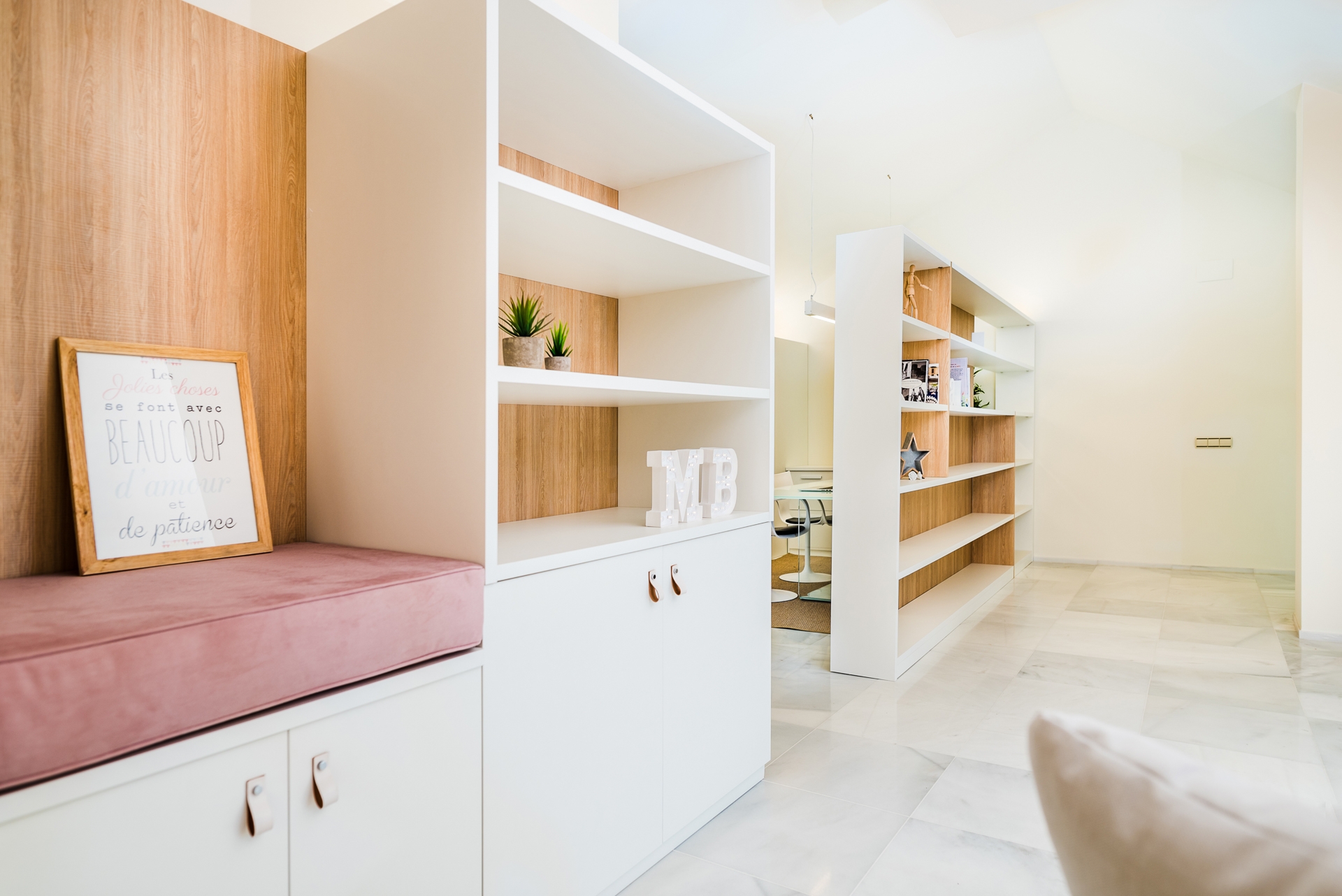 Los propietarios necesitaban sacar el máximo partido a la buhardilla del dúplex, con más espacio de almacenamiento, zonas de descanso y un despacho. Esta reforma fue todo un reto ya que la cubierta constaba de tres planos distintos de inclinación. Lo resolvimos distribuyendo estratégicamente las zonas de la vivienda, y separándolas con mobiliario adaptado al espacio al que nos enfrentábamos. Sí, sí. Solo empleamos mobiliario. Cerrando un espacio y generando el resto de estancias según ambientes.